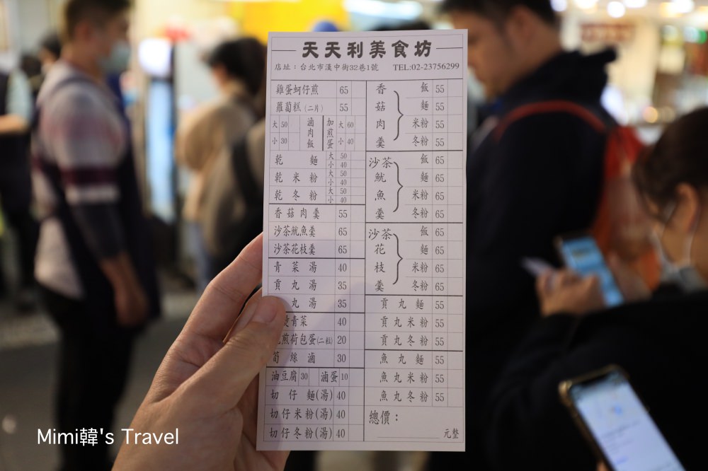 天天利美食坊就在謝謝魷魚羹旁邊,兩家其實都是西門町美食老店,我們這天來的時候大批觀光客們根本沒在怕啥咪武漢肺炎,大家戴著口罩還是排隊等著用餐。排隊的時候店員就會先拿菜單出來發,可以事先填好要吃的東西。