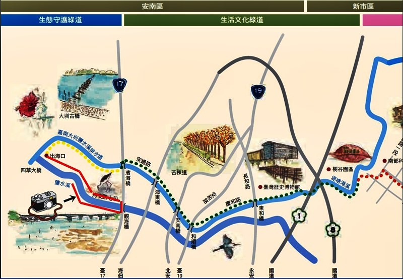 可以從安平市區經過鹽水溪堤防、嘉南大圳防汛道路、台灣歷史博物館…
