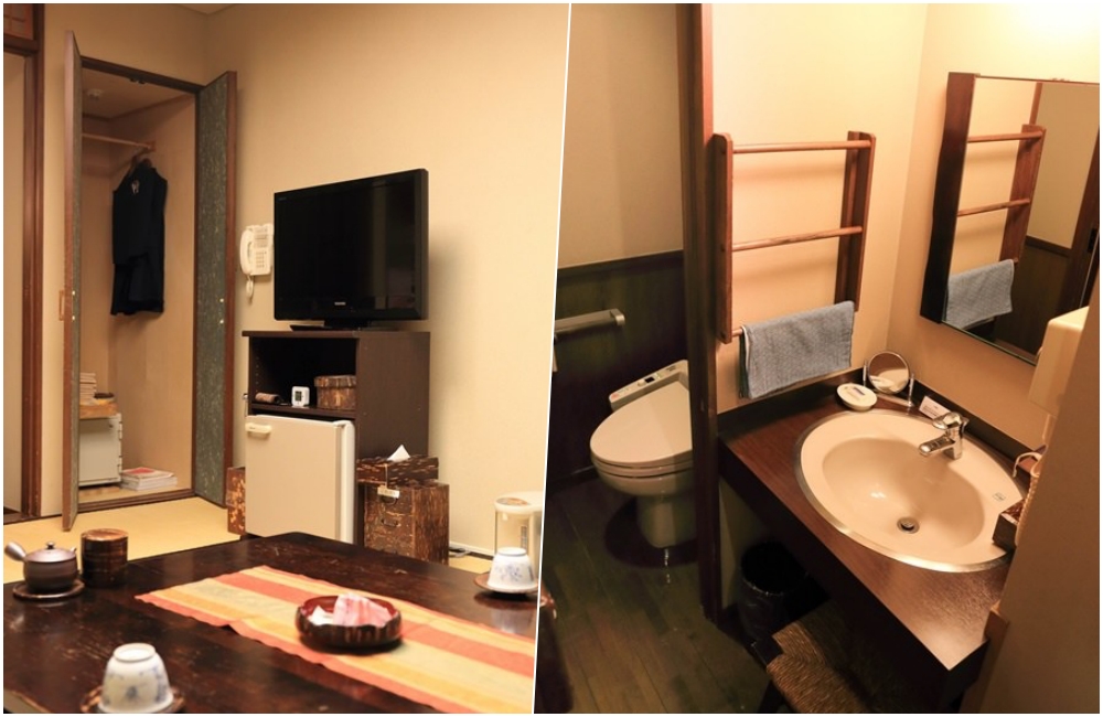 拉開房門,純粹的榻榻米香與窗外溪流聲瞬間讓人卸下疲憊,日式鋪床暖暖的很舒服。不過要先知道,日本鄉下像這樣的傳統溫泉旅館的基本房型部分會沒有洗手台、或是沒有淋浴間(只能去大浴池洗澡)。而且木造建築隔音較差,走廊腳步聲或隔壁有較大動靜會容易傳入。