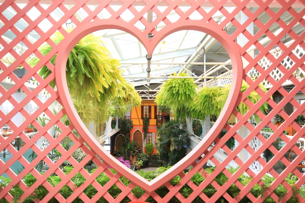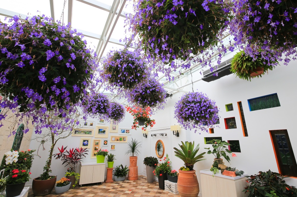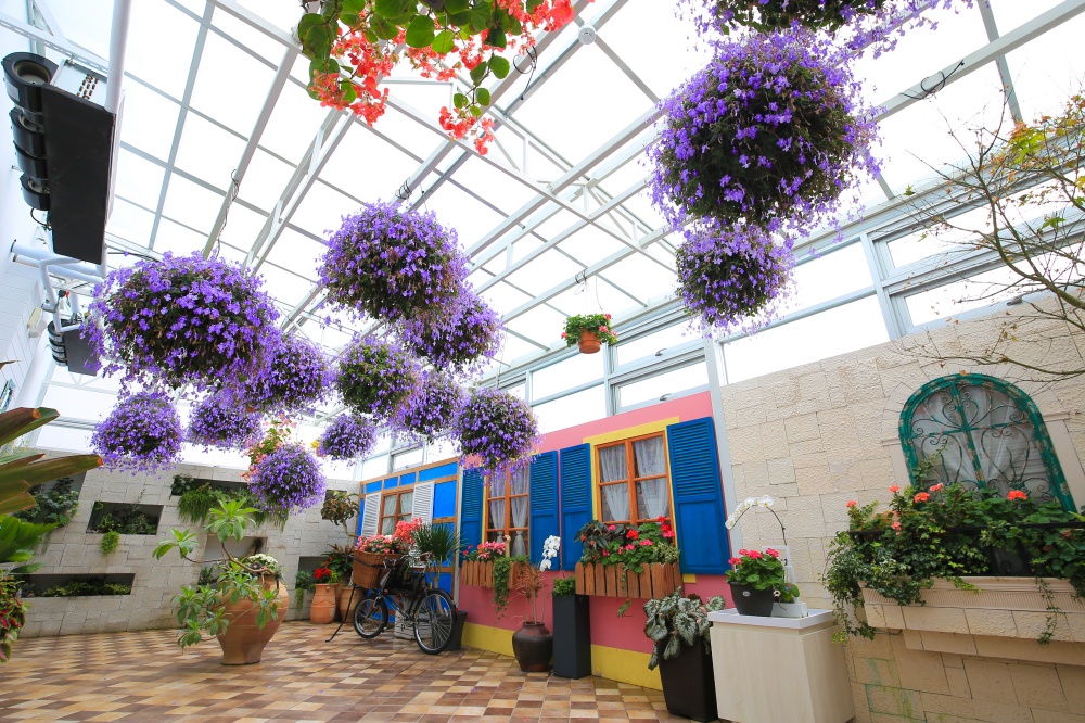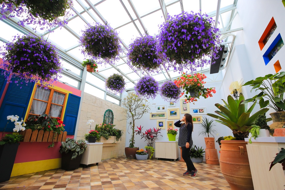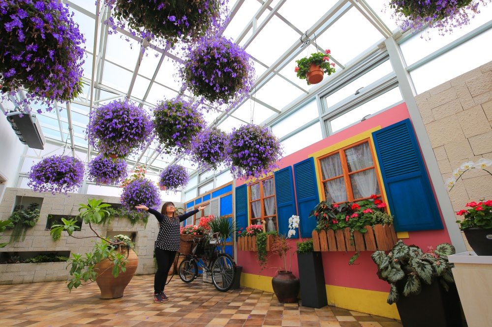 一定一定不能錯過的還有這間特別打造的玻璃花房唷!她就在從蘭花展售區要上三樓的電梯旁,門口並不特別引人注目,但走進來絕對會有驚喜,一球球漂浮在空中的海豚草正盛開著好夢幻。