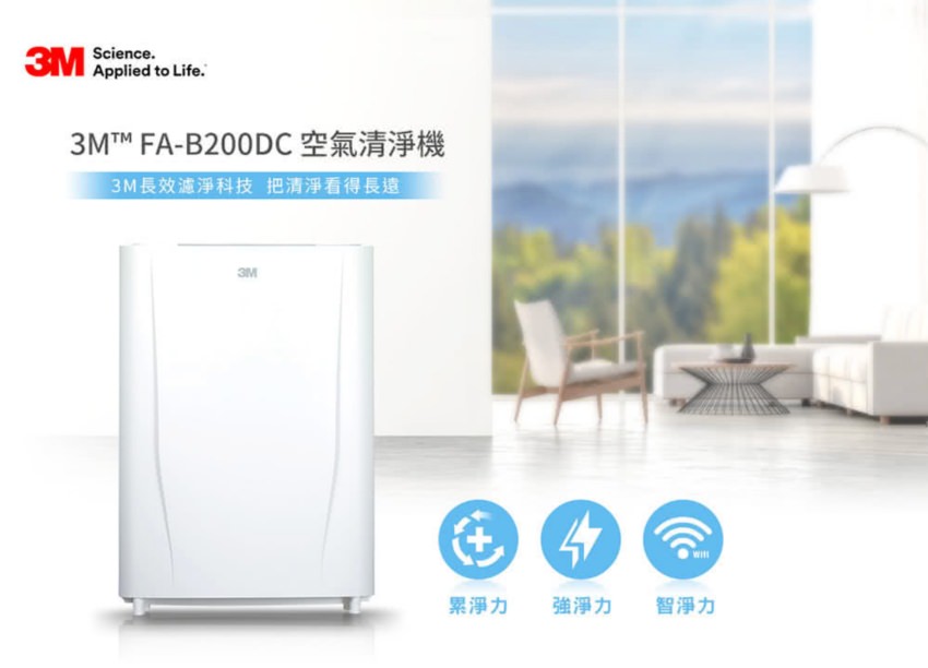 3M空氣清淨機(FA-B200DC)是新一代機種,適合中大空間使用,搭配3M最新長效型靜電濾網,據官方數據可以提升2倍淨化量。而CADR風量220CFM,10分鐘即快速濾淨99.9%空氣中總生菌數和99.9% PM2.5。像是全平面的大樓公寓,客廳+玄關+飯廳+開放式廚房放一台全搞定超棒。