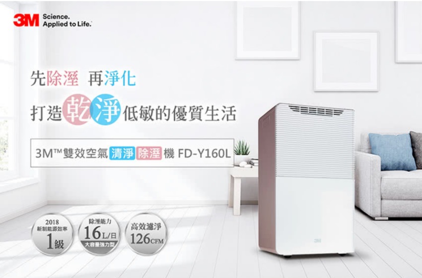 3M空氣除濕清淨機FD-Y160L,標榜先除濕再淨化,而且就算三機一體,CADR值也來到126CFM,搭載3M獨家的超微米雙效靜電濾網,能過濾空氣中大部分過敏原與最小到0.003ppm的懸浮微粒,即使不除濕也能當空氣清淨機使用,如果想要同時搞定清淨+除濕可以考慮這臺。
