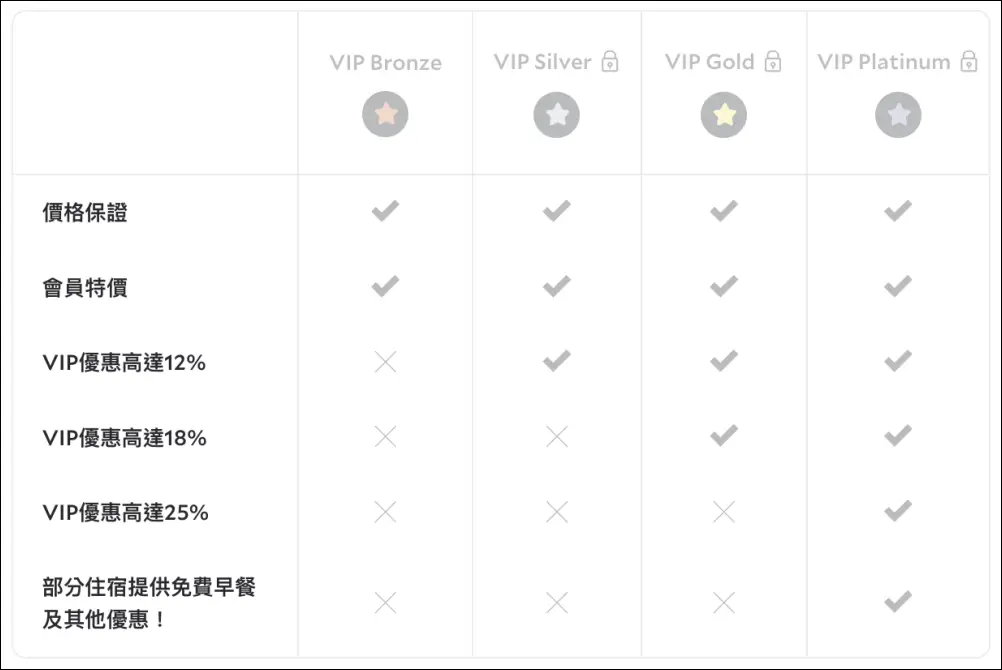 除了折扣碼,Agoda會員本身也有許多隱藏優惠,只要登入會員,就能享受專屬房價與VIP等級折扣,會依訂房次數升級,等級越高折扣越多。