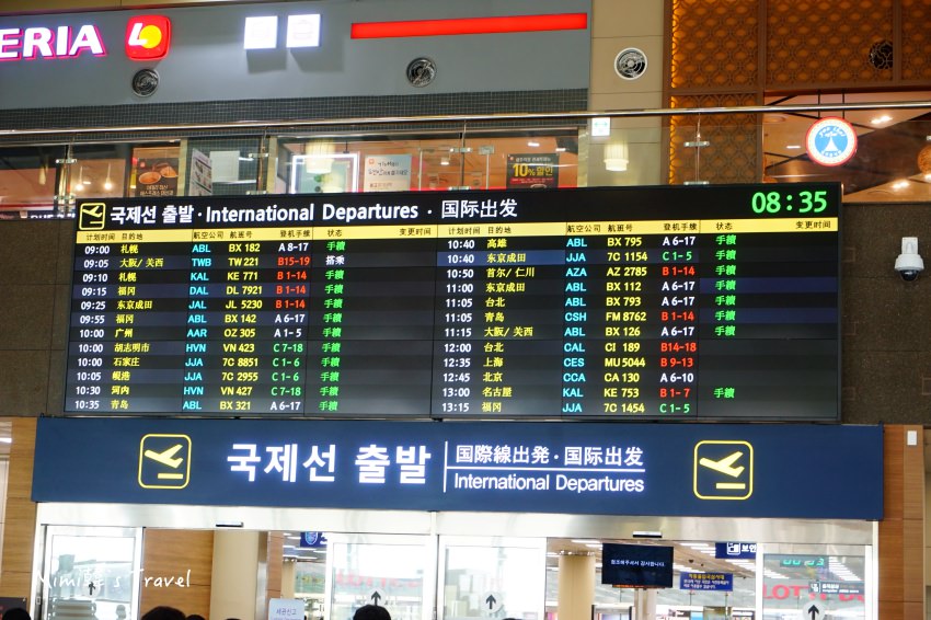 我們是從西面站搭地鐵過來釜山金海機場,全程28分鐘算是滿快速的,就算我們這天要搭10:40的班機,也不用起太早。而金海機場的國際線大廳,航空公司櫃台的安排是長條狀的,沒辦法一眼就看到釜山航空,要找一下中間的電子看板,有中文顯示,並不會有障礙。