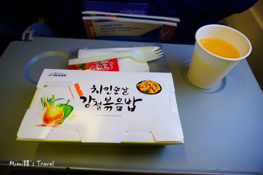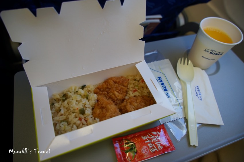 這天的飛機餐是炸雞炒飯,米飯粒粒分明,口味還可以,不會很油膩也不會辣。但份量不是很多,如果怕餓著還是建議在機場時就多少吃點東西比較好。飲料有果汁、咖啡、綠茶、開水可以選。