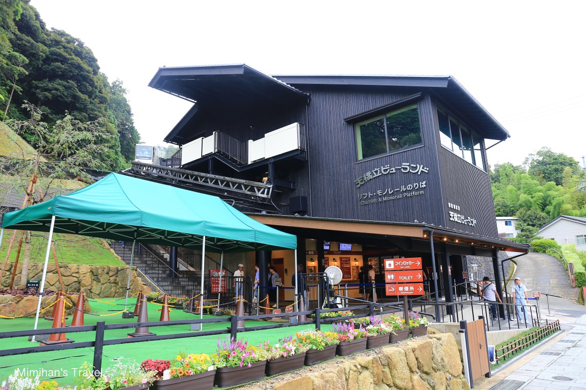 從天橋立車站或主要街區,順著指標大約走10分鐘就能抵達天橋立View Land登山纜車站,購票之後可以自行選擇搭乘像滑雪那種空中吊椅或是斜坡纜車上山,我們這趟是來回通通搭空中吊椅,因為小朋友喜歡。