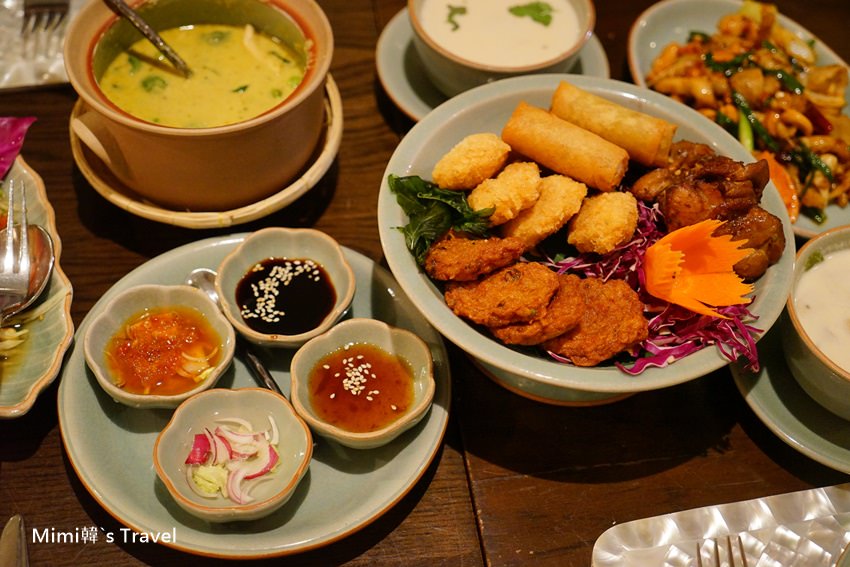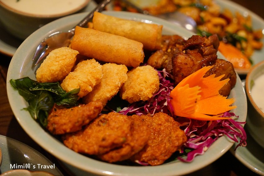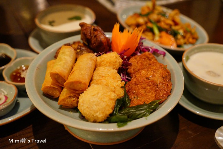 炸物拼盤,旁邊還搭配四種醬料可以沾著吃,整個擺盤很有泰國特色,看起來更可口~