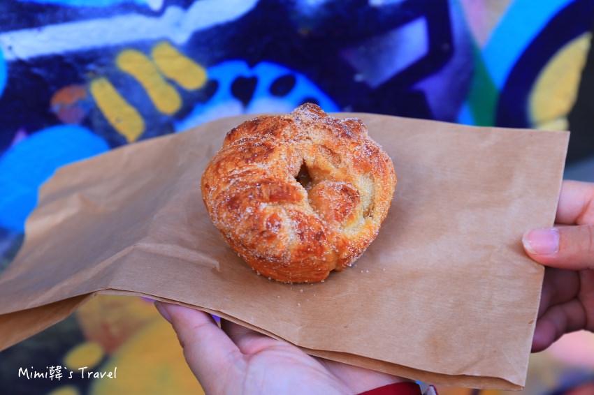 剛入手的肉桂捲還帶著溫溫的熱度,外層撒著細白糖粉,咬下去很酥鬆香甜,接著口中就傳來陣陣香氣,瞬間就被我倆吃光光哩!