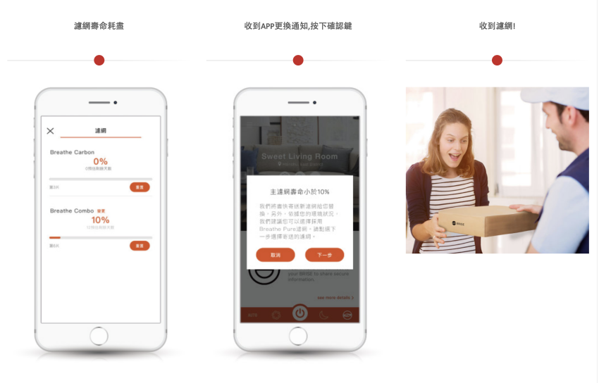而從更換濾網這點也可以感受BRISE努力減少大家的瑣事,因為HEPASmart會主動針對使用狀況,偵測濾網的更換時間,然後APP也會主動通知濾網壽命,再加上濾網吃到飽&免費送到府服務,對提升整體使用者體驗很有幫助喲!