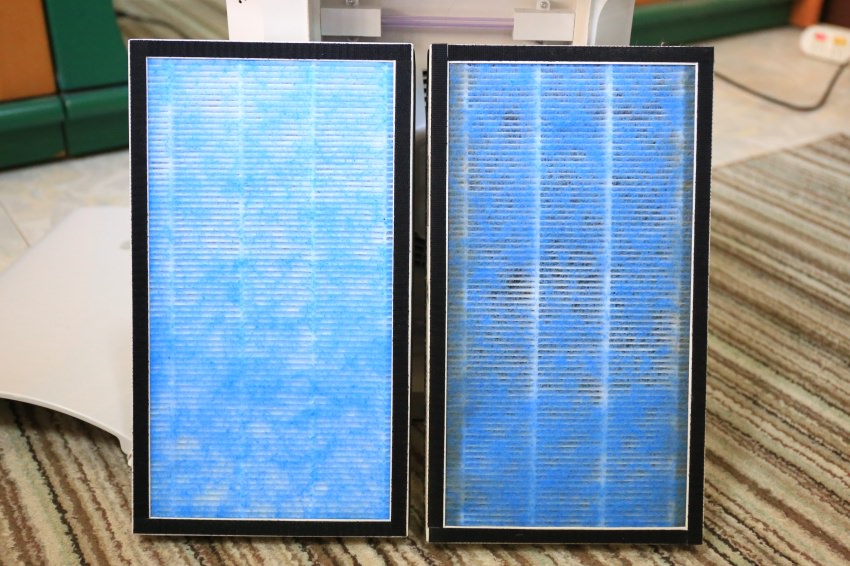 順便拍更換濾網的情況給大家瞧瞧,就算隔著一藍色過濾層,還是可以看到裡面白色濾網好髒啊~