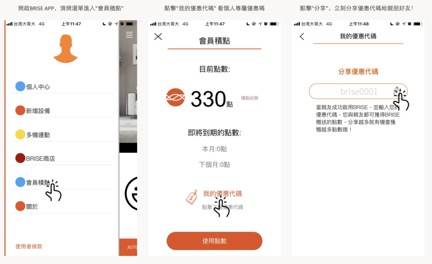 啥咪是有福同享?只要像Mimi這樣介紹親朋好友、厝邊隔壁購買BRISE C200空氣清淨機,分享優惠代碼給網友輸入使用,當對方註冊BRISE APP並成功啟用BRISE C200後,這樣你也可以拿到點數喔!(原本點數是330點,現在直接變成兩人都660點,更划算 😆 )
