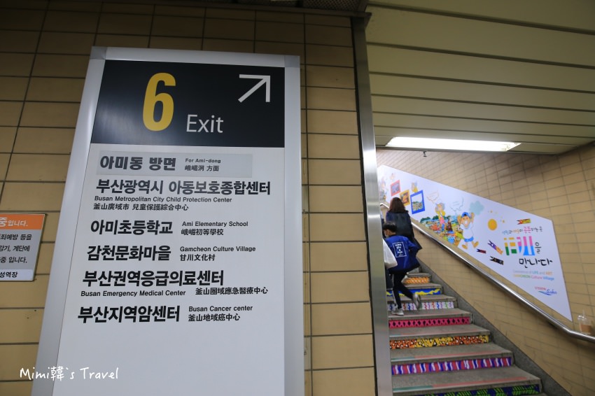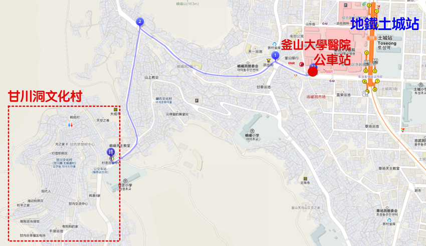 先簡單看看釜山甘川洞文化村的交通地圖,土城站是離它最接近的地鐵站,不管是住在札嘎其、南浦洞的飯店要過來都很方便,搭個1~2站就到了。接著從6號出口,走3分鐘到釜山大學醫院旁的公車站等車,班次很密集不會等太久,上車後大概10分鐘左右就能抵達甘川洞文化村,目前搭巴士是最便宜的交通方式。