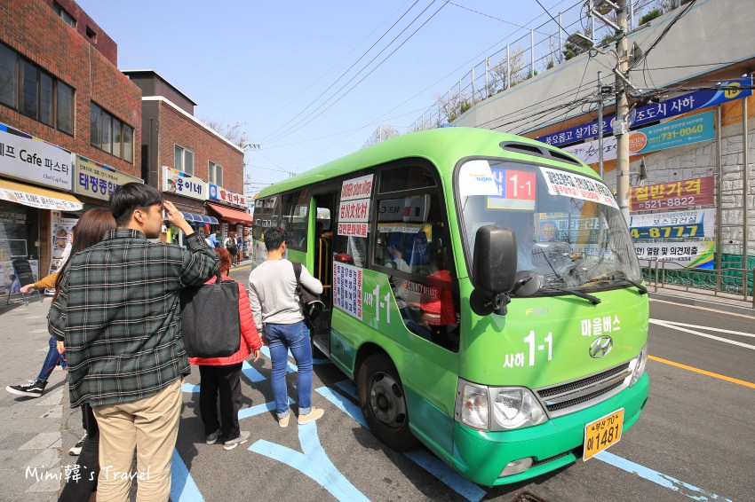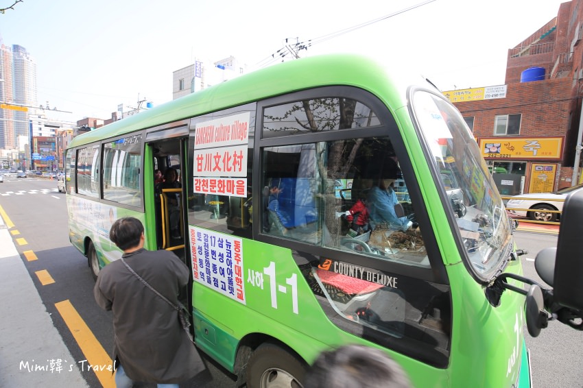 可以搭到甘川洞文化村公車有三班,分別是1-1、2、2-2,都是像這樣的小巴,車身上都有清楚用中文寫著甘川文化村,應該是不會認錯或搭錯,到甘亭小學站(감정초등학교)下車,下車後就是甘川文化村了。