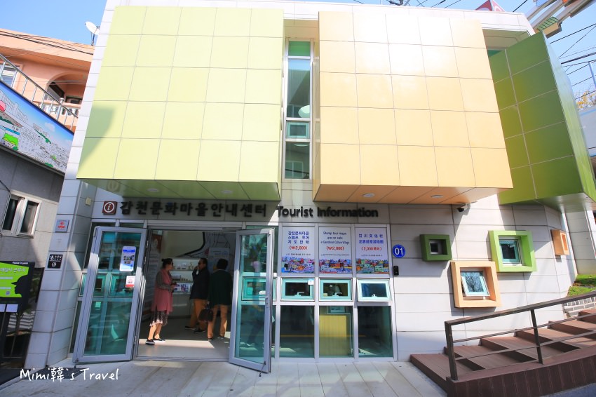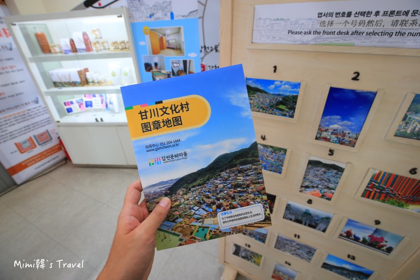 其實有很多地方都可以進入甘川文化村(村莊怎麼可能只有一個入口),但公車停靠點的這個入口算是代表性起點,有設置旅客服務中心,也能在此買到整個甘川文化村的蓋章地圖,有中英日文版能選,集滿可以換明信片,只是我對集圖章沒太大興趣,就沒特別去收集了。接著就可以開始拿出手機相機,準備拍好拍滿囉~