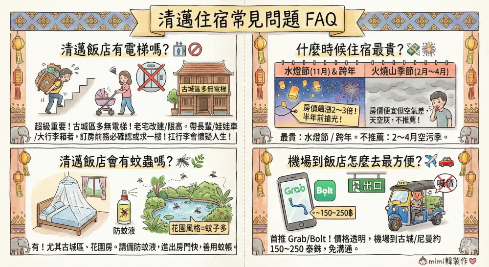 這點超級重要!清邁古城區很多飯店「沒有電梯」。古城區為了保護古蹟景觀,有樓高限制,且許多飯店是由老宅改建,因此沒有電梯是常態。如果你帶長輩、娃娃車,或是行李箱29吋裝滿滿,訂房前一定要先確認是否有電梯,或者請飯店安排一樓房間,不然扛行李會扛到懷疑人生。