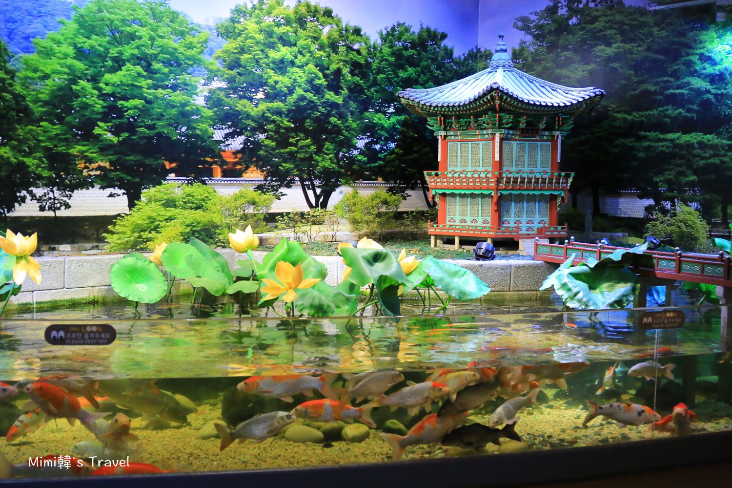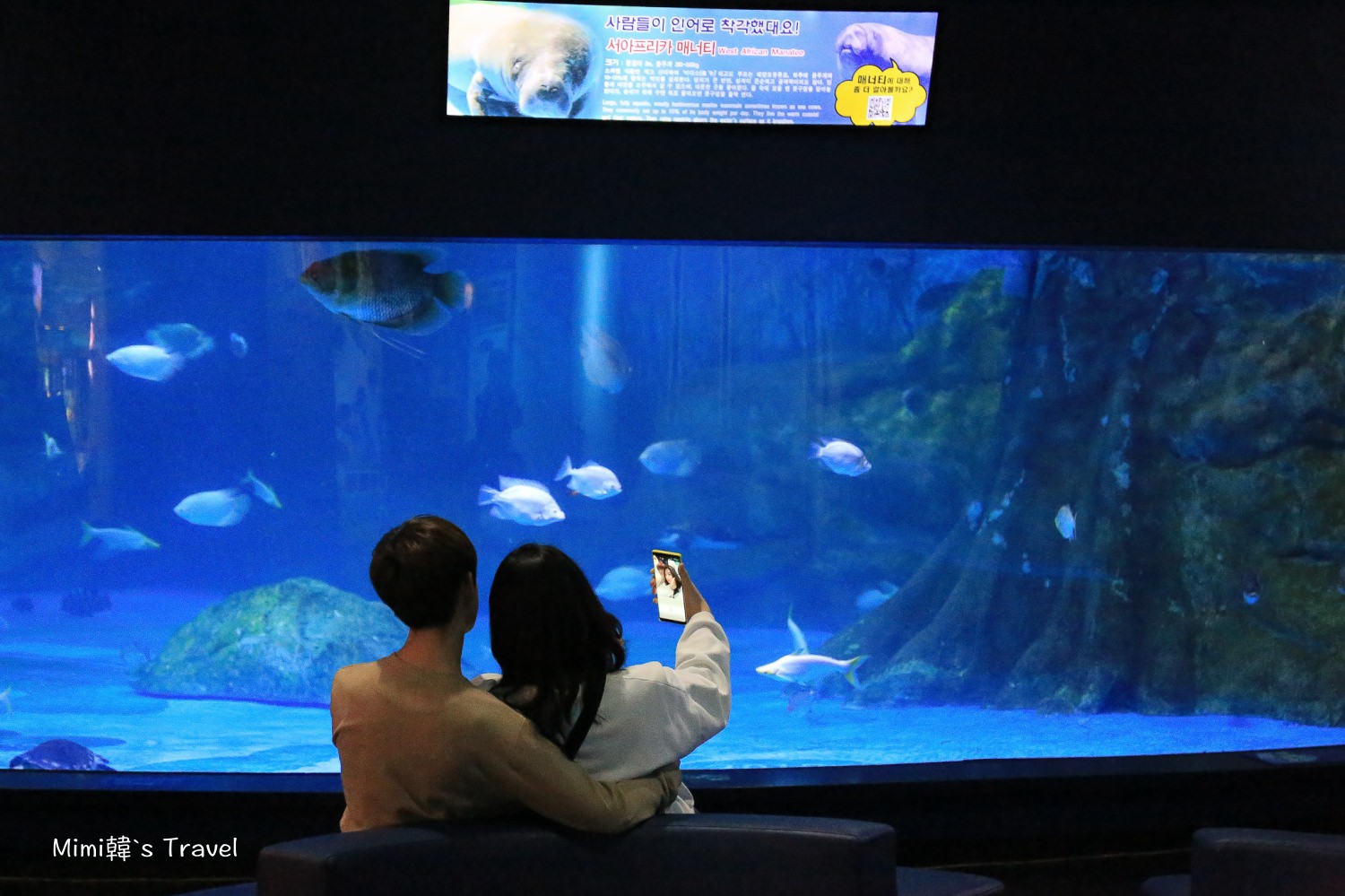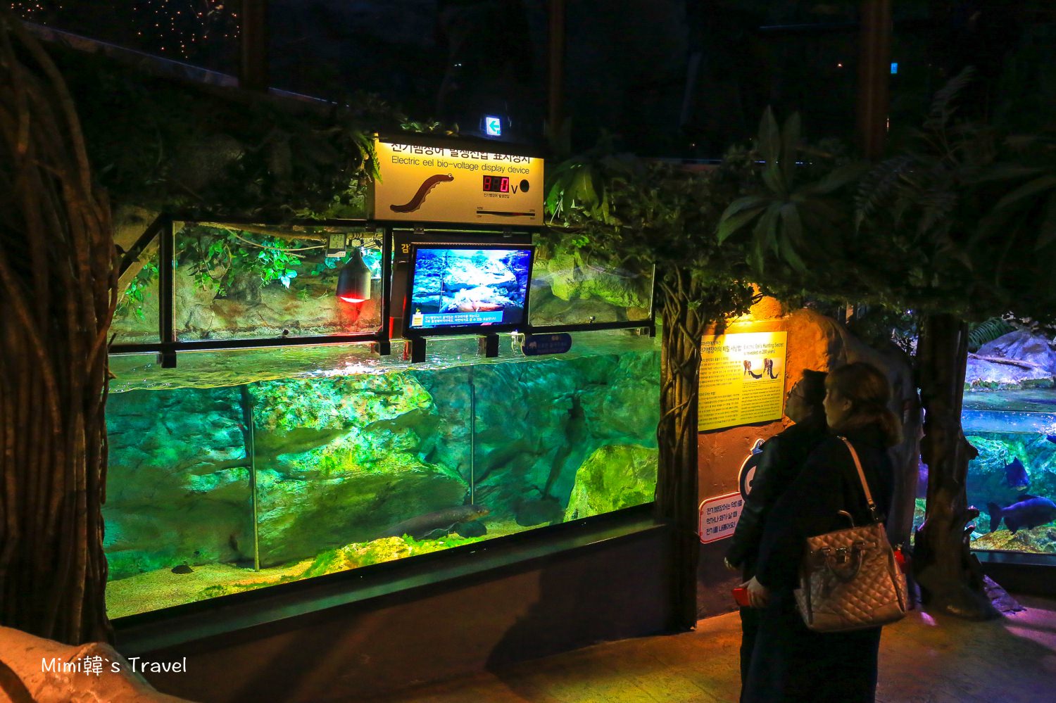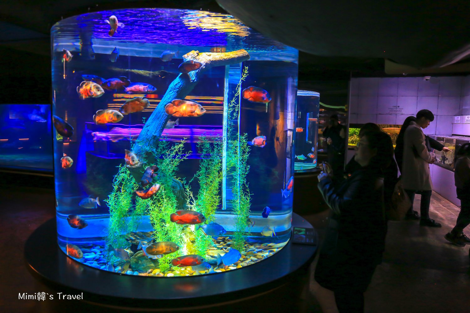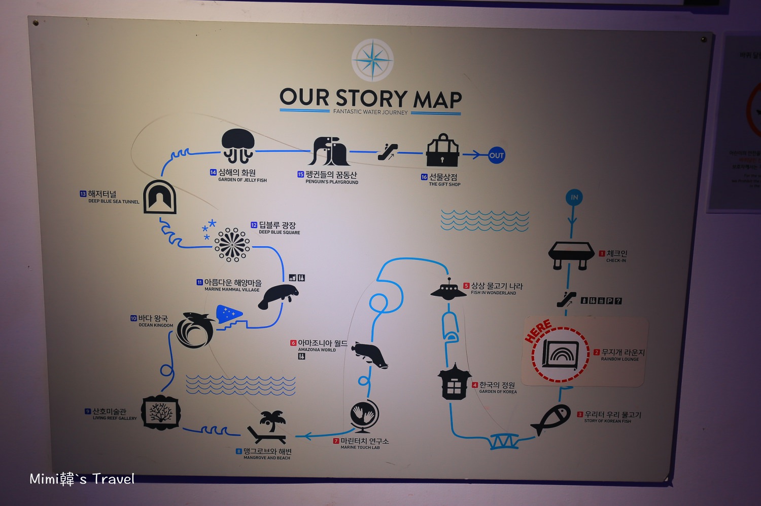 館內以「 夢幻水之旅 」為主軸,規劃包含韓國魚類、韓國庭園、奇特魚類、亞馬遜世界、兒童科學水族館、紅樹林、海底隧道、海洋哺乳類專區⋯等16個不同主題的區域,大概可以規劃停留2個小時。