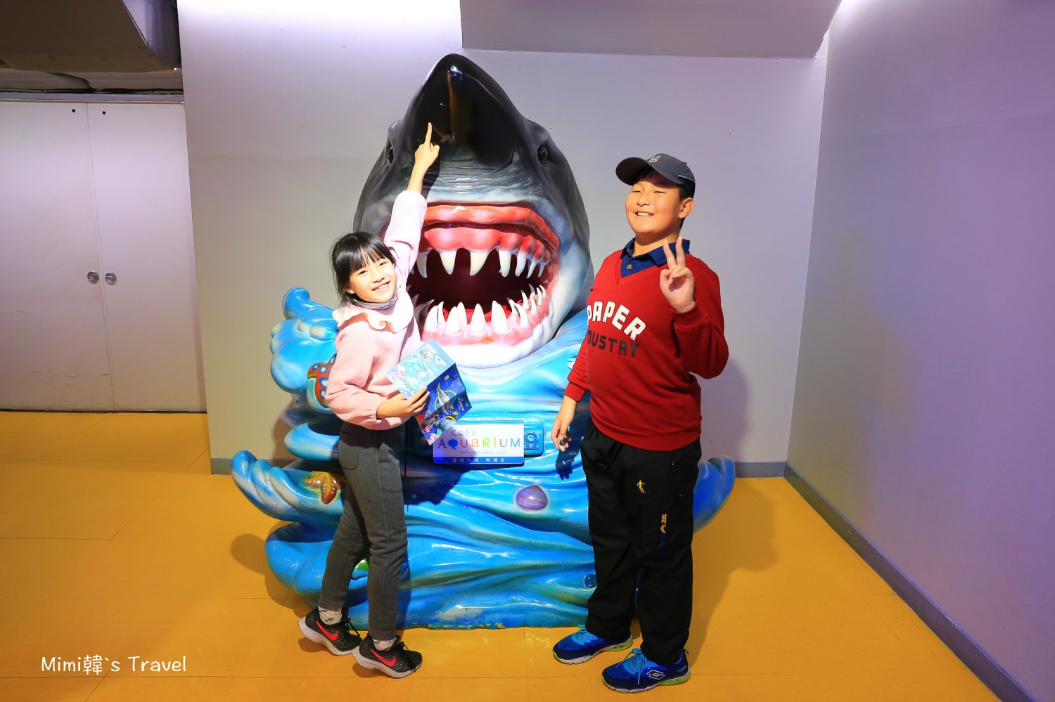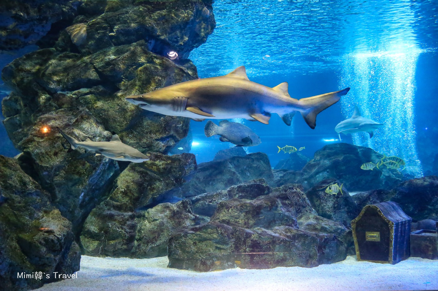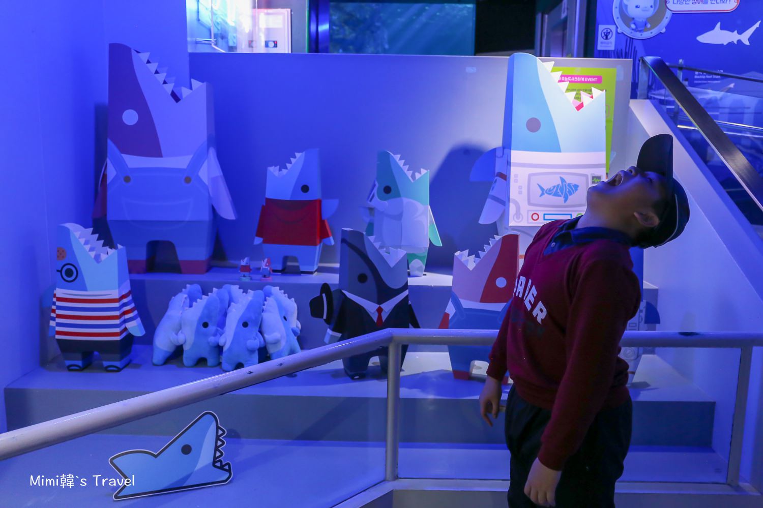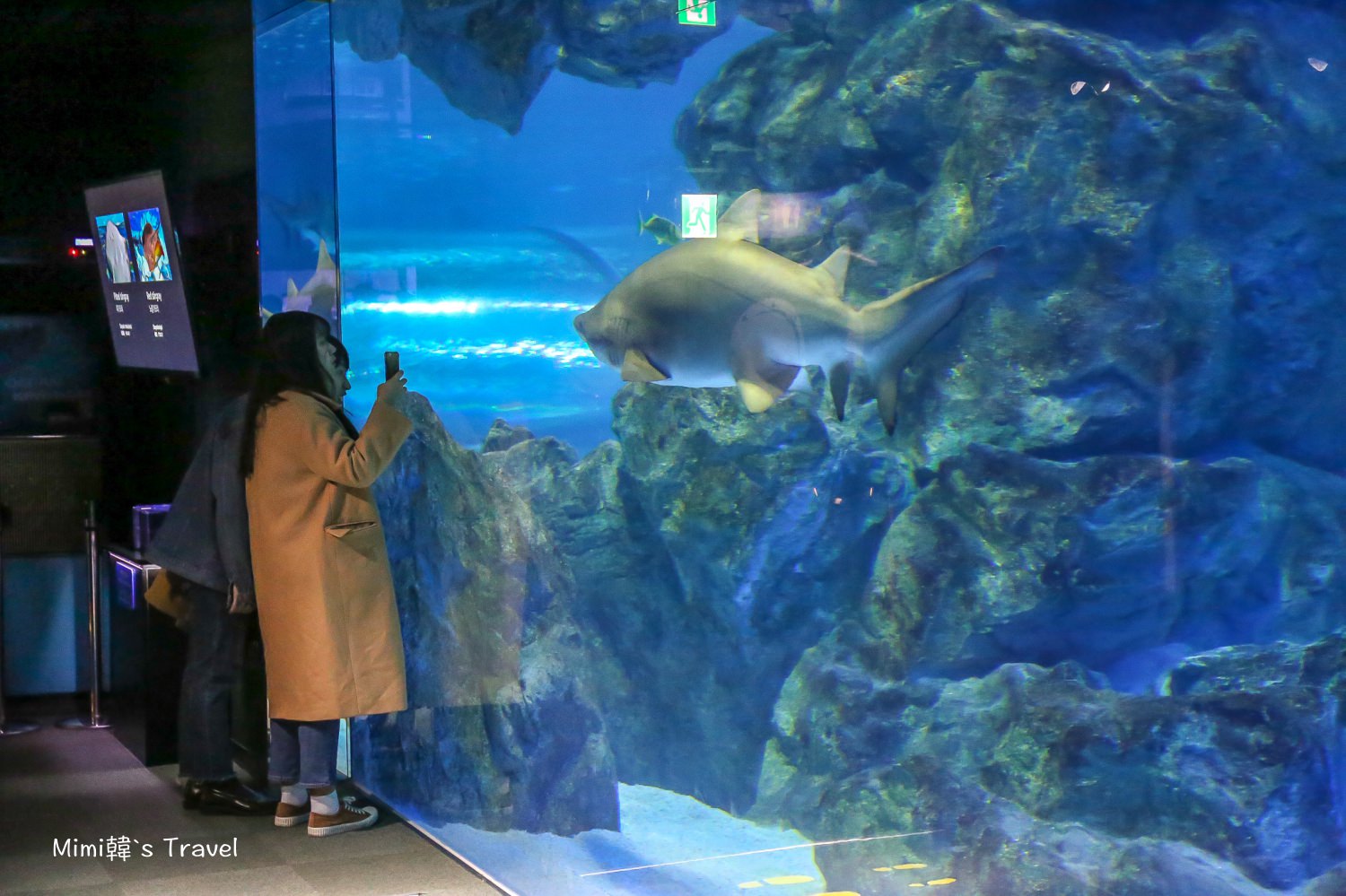 貫通兩層樓的巨大水槽,裡面生活了好多海底生物,其中最讓我驚喜的就是竟然有很多滿嘴尖牙利齒鯊魚,每隻近看都好兇猛,看來韓國人強悍的性格就連水族館的呈現也或多或少受到影響。