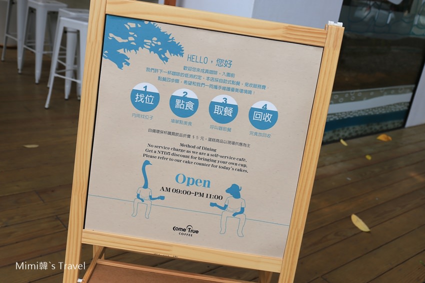 消費的方法清楚的寫在入口處:找位置→點餐→取餐→自己拿去回收台,低消是一杯咖啡,自備環保杯的話,飲料可以折抵5元。