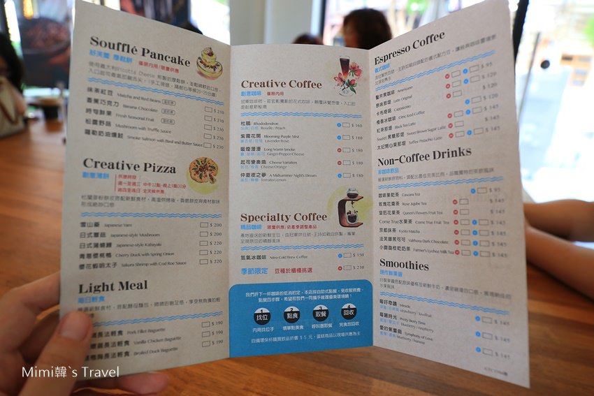菜單上咖啡選擇不少,精品咖啡、義式咖啡、創意咖啡;也有花草茶之類的飲品。想吃點東西的話,可以點舒芙蕾、輕食、創意薄餅等,其中看現場最受青睞的就是ㄉㄨㄞㄉㄨㄞ的舒芙蕾了,幾乎每桌都有點 😆