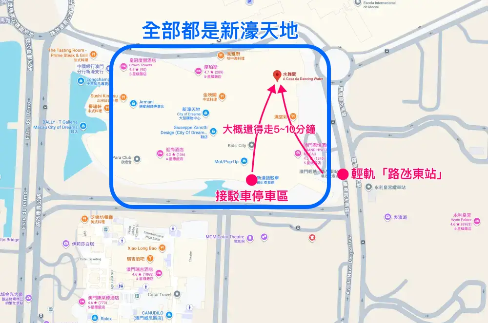 - 輕軌:推薦!搭乘澳門輕軌到 路氹東站,出站後走過天橋直接就是新濠天地的入口,這是最不容易遲到的方法。