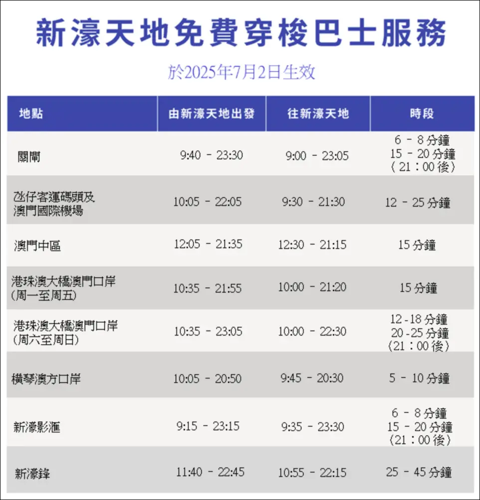 - 接駁車:從港澳碼頭、關閘或路氹邊檢大樓都有免費接駁車直達新濠天地。