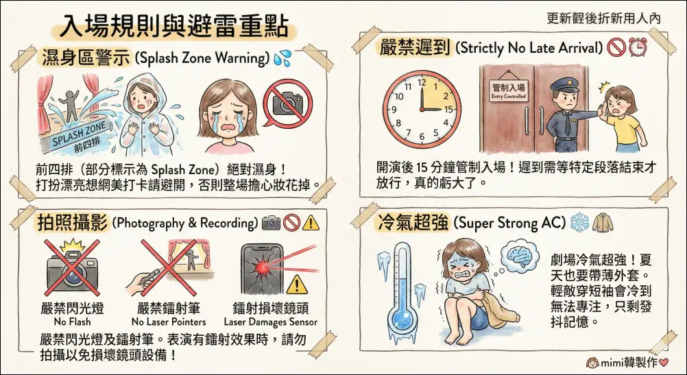 - 濕身區警示:前四排(部分標示為 Splash Zone)的觀眾絕對會被水噴到,如果你打扮得很漂亮想去網美打卡,購票時記得避開前幾排,否則整場秀你都會在擔心妝花掉中度過。