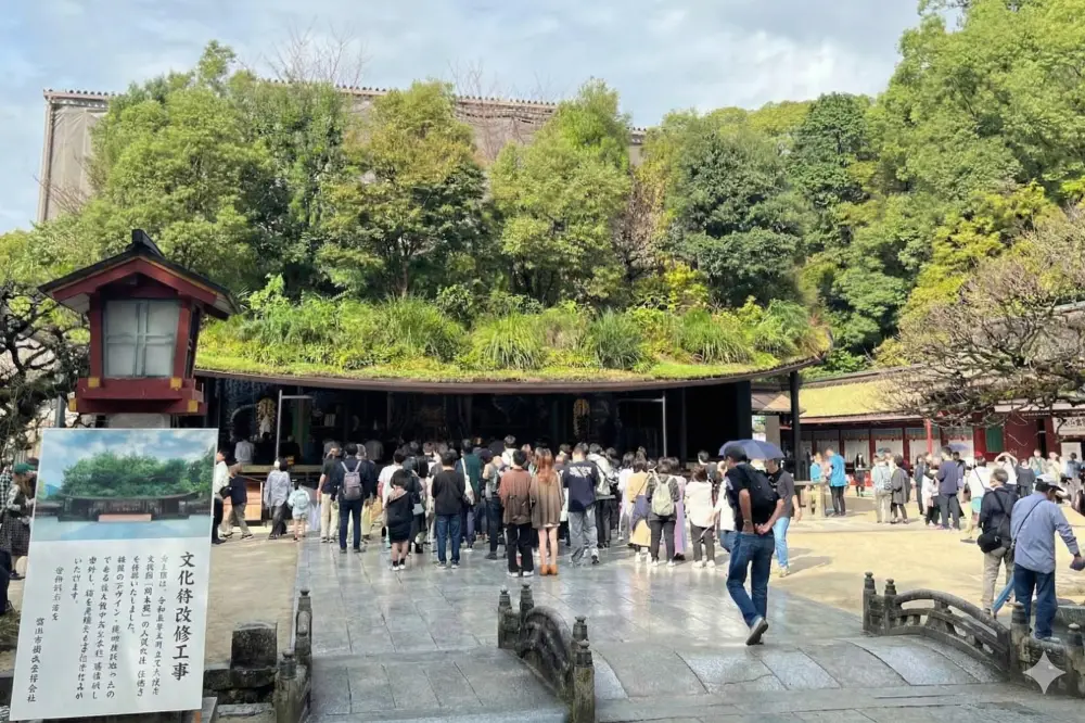 這座臨時本殿真的美到不行!屋頂上種滿了真正的樹木和植物,看起來就像一座「漂浮在空中的森林」,充滿了現代感與神祕感。雖然看不到古色古香的老本殿有點可惜,但能看到這個期間限定的藝術品,我覺得反而更值得!