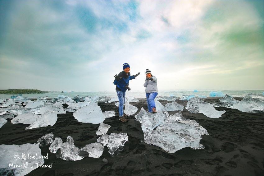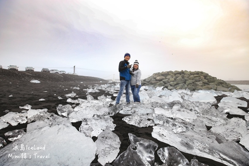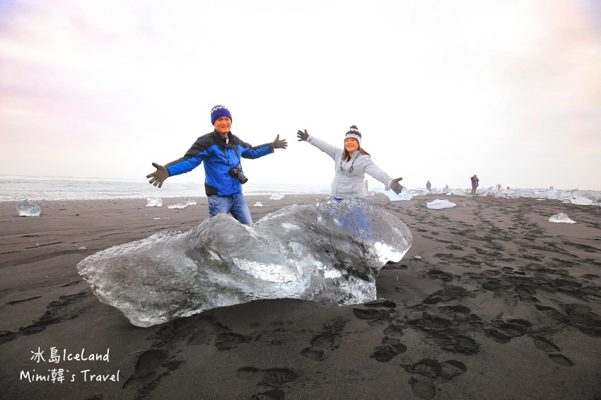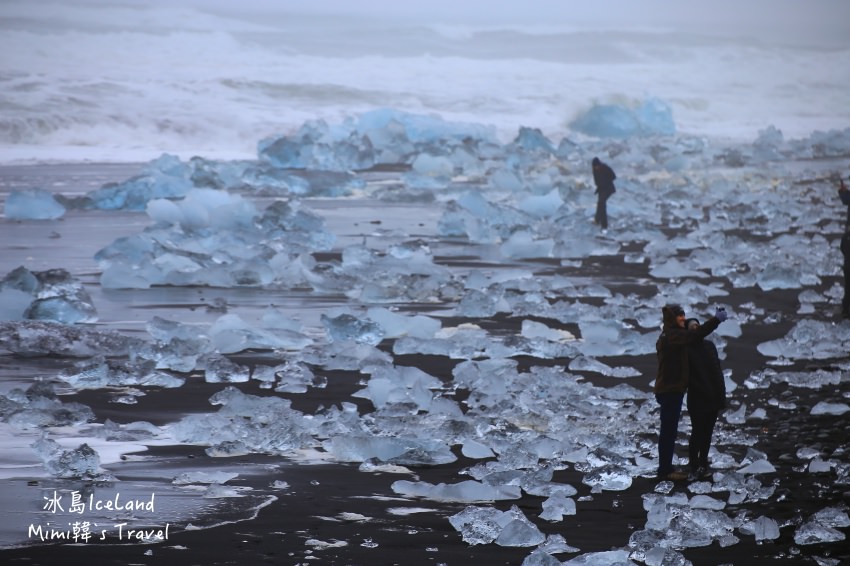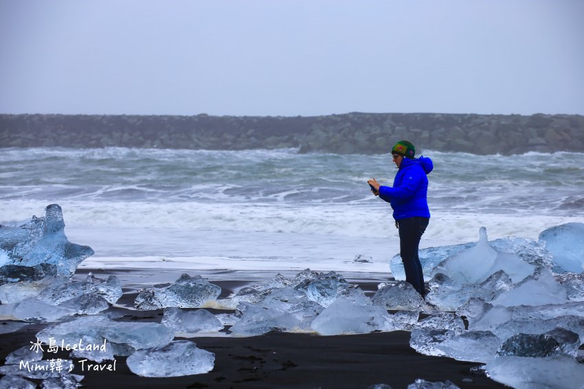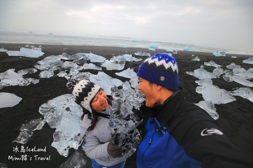 我們連續兩天都過來鑽石沙灘(Diamond Beach),因為第一天來的時候已經很晚再加上天氣海相都不好,再加上應該是漲潮時間,浪大的有點恐怖,想靠近冰塊拍照還得隨時注意準備跑路,現場看好幾個遊客為了拍照都被沖倒,幸好沒被捲下去,整個險象環生。但我家攝影師不死心,決定隔天早上再衝一波,所以會有兩組不同的照片,但可惜的是隔天天氣依舊不好,但至少可以下去玩冰塊了 😆
