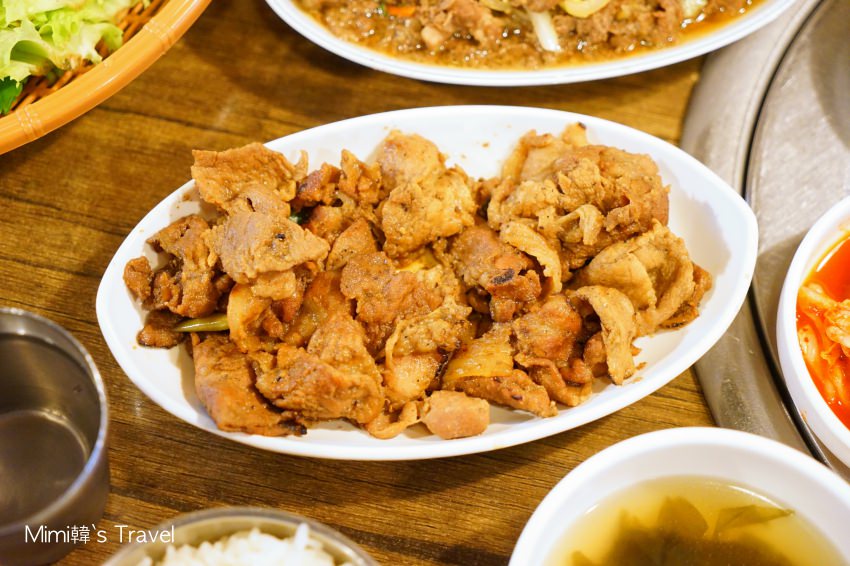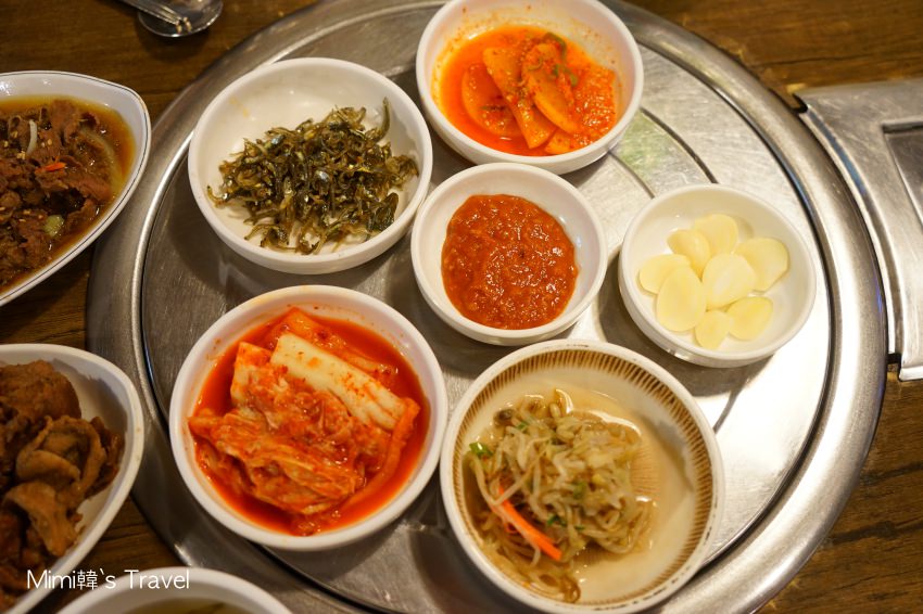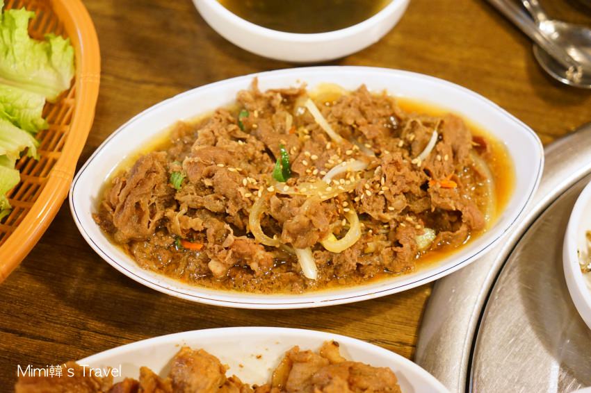 我們想說肚子很餓又懶得自己烤,就直接選了烤豬肉套餐(7,000韓元)&烤牛肉套餐(8,000韓元),是由老闆直接烤好,不只省事,而且交給專業的來烤應該比較好吃啦!和搭配的泡菜小魚乾等,直接擺滿好豐盛的一桌。