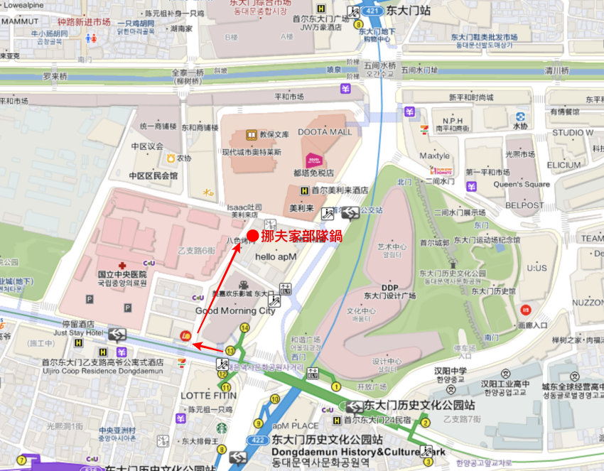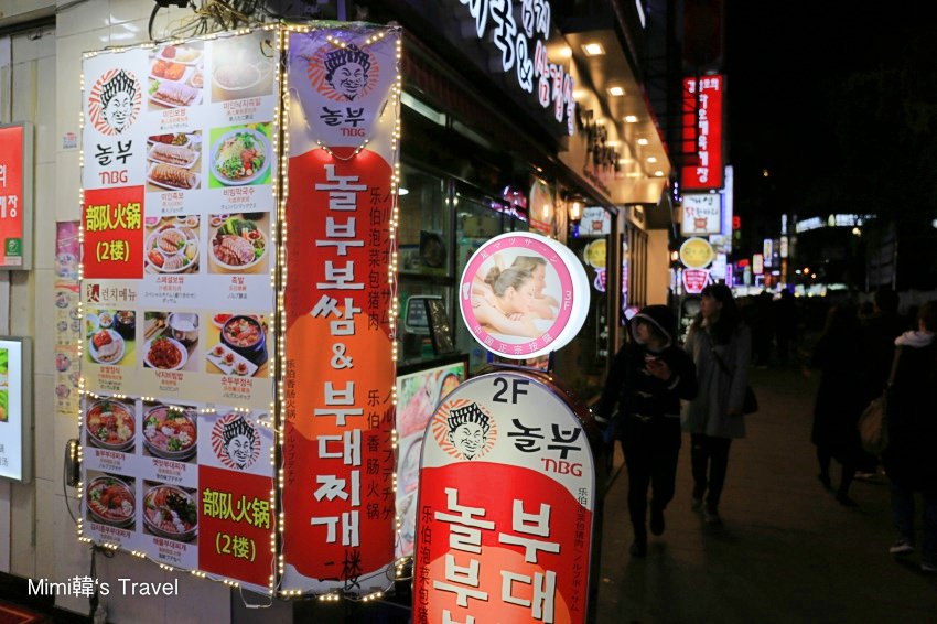 我們在東大門吃到的這間挪夫部隊鍋(놀부부대찌개&철판구이),大陸人叫乐伯部队锅&铁板烧,是韓國很有名的部隊鍋連鎖店,而挪夫部隊鍋東大門這家分店就在東大門歷史公園站旁,附近全都是東大門熱鬧的批市百貨,逛街前後要來覓食超方便的 😆