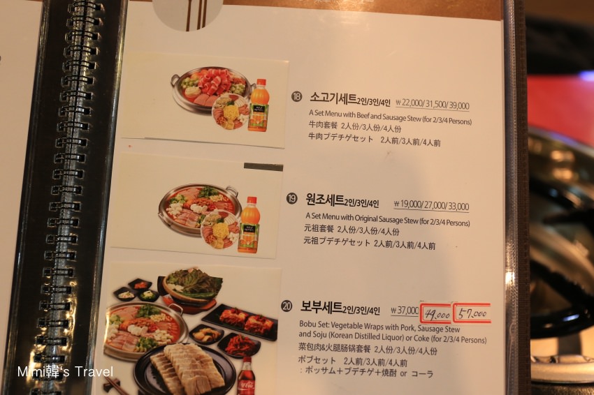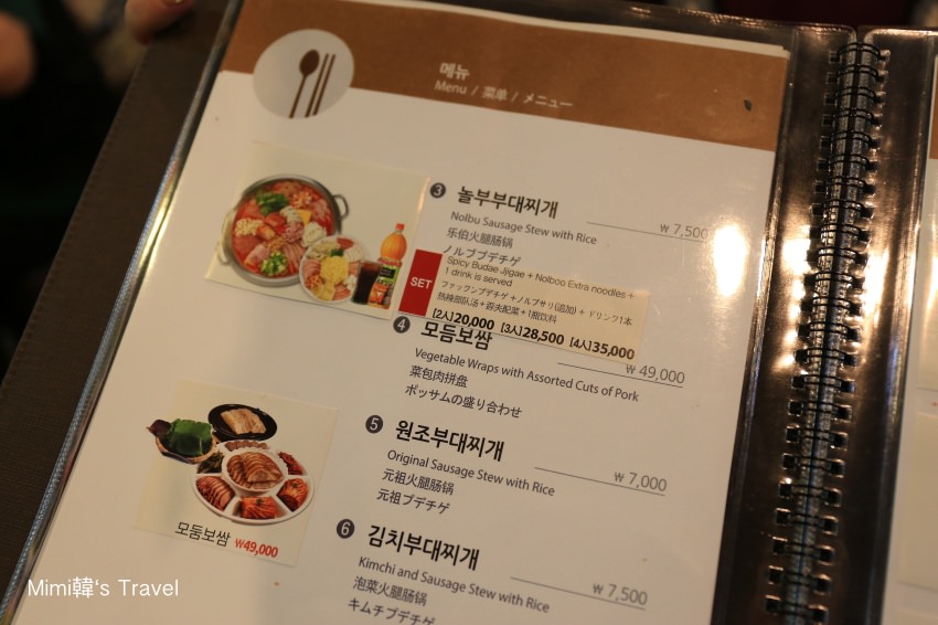 我們直接點兩人份20,000韓元的招牌樂伯部隊鍋(菜單翻譯成火腿腸鍋),會有一份熱辣部隊鍋、挪夫配菜和飲品,店裡滿特別的是還有賣菜包肉拼盤,也有推出套餐,不過當下只有兩個人,戰鬥力不足,有興趣的朋友可以嘗試看看。