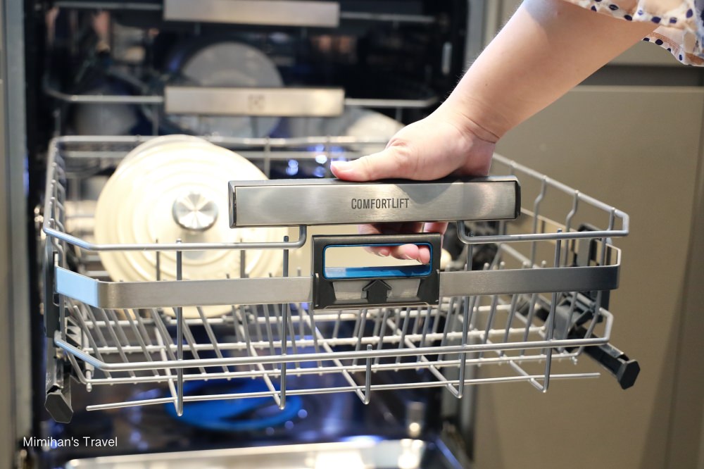 然後伊萊克斯洗碗機(ESL7845RA)也有顧到這點,加入了獨家ComfortLift上拉式籃架設計,下腰彎腰通通都不用,輕輕往上拉就可以收放餐具。而且它的提籃都有特殊自動回歸絞鏈設計,只要輕推它又會慢慢自動降下去,不用擔心碗盤乒乒乓乓撞來撞去。