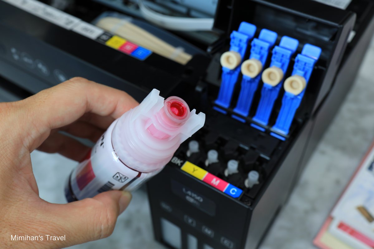 然後Epson L4150還有個很貼心的設計,就是墨水填充是有防呆機制,只要把墨水瓶對準插槽插好,接著墨水就會自己流到墨水盒中,不用擠壓,加滿會自動停止不會溢出來,不用擔心會漏墨。而且各色墨水瓶的溝槽都是不同的,顏色沒對好也是沒辦法插進去的唷!完全很難弄錯 😆