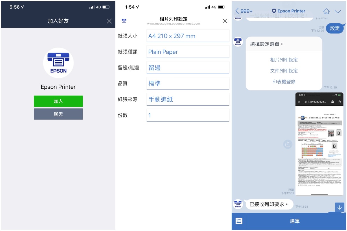 但現在有了Epson Printer好友,我不管在哪裡,只要把檔案傳到Epson Printer LINE帳號上,家裡印表機就會列印出來,看是要印相片或文件都沒問題,而且直接就可以快速調整各項列印設定。我覺得這功能對於提高職場業務效率也很有幫助,像是人不在公司,老闆卻臨時要資料、同事需要數據報表等,馬上就可以處理。