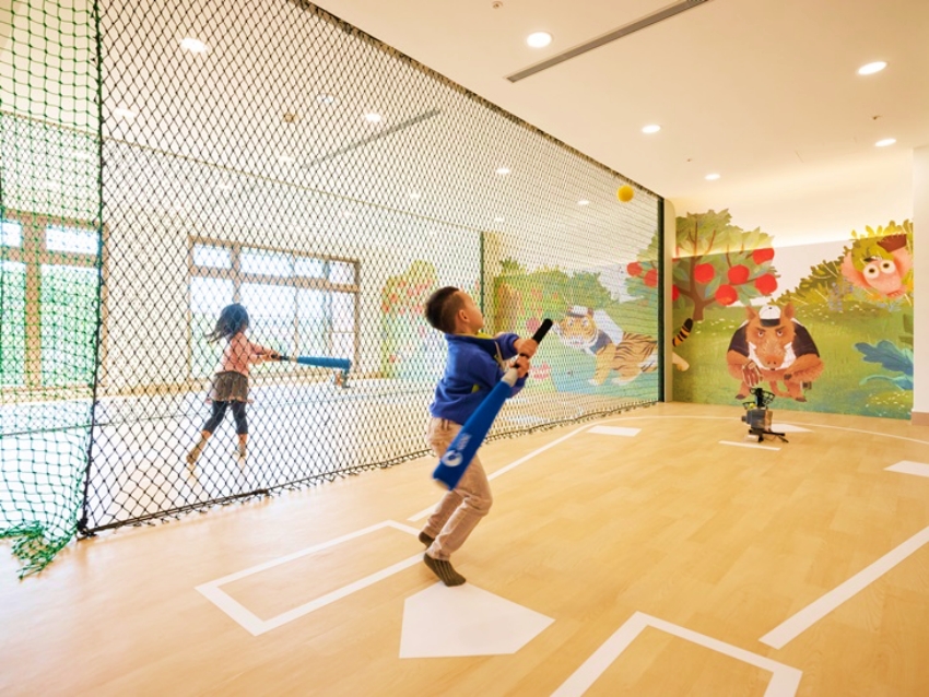 說真的住過很多親子飯店,溜滑梯、積木、球池還蠻常看到,但名人堂花園大飯店絕對是唯一有棒球打擊區的酒店,場地一邊是固定式的打擊、另一邊則是有投球機的,都是安全性高的軟球軟棒,對小朋友來說超級好玩。