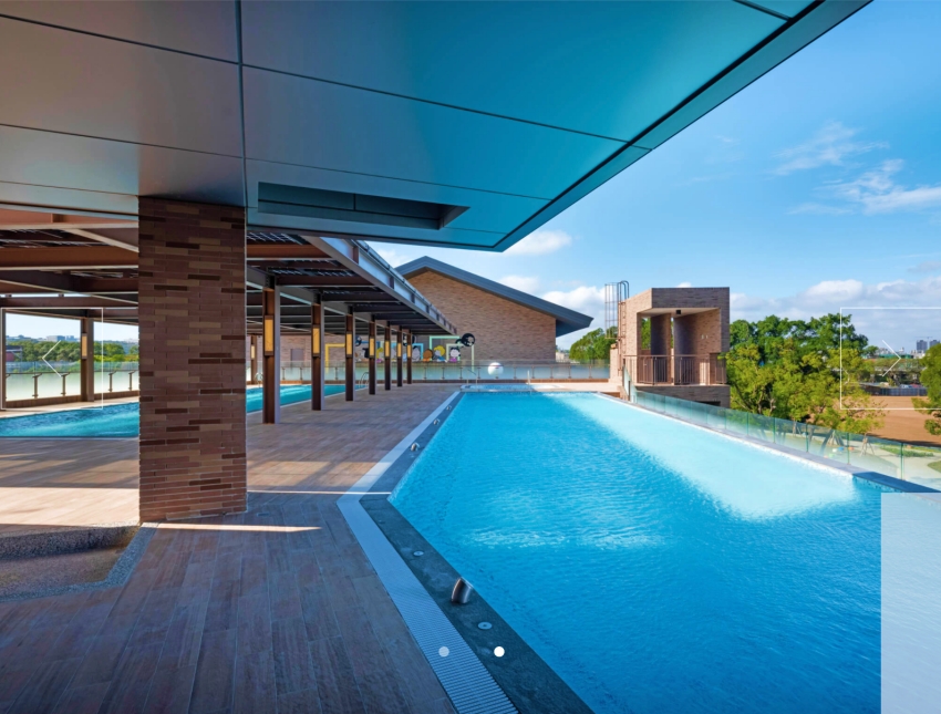 半露天式的無邊際泳池超美,有戶外兒童戲水池、半室內溫水游泳池、戶外景觀SPA等區域,正對著名人堂花園大飯店的花園設施,還能看到旁邊據說是台灣職棒發源地的龍潭兄弟棒球場。
