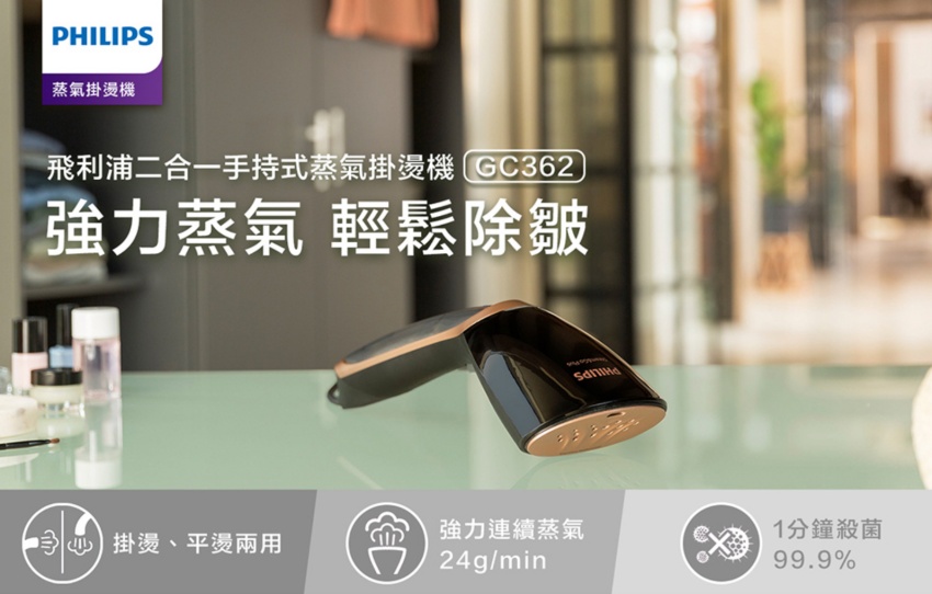 推薦這個飛利浦手持式蒸汽掛燙機(GC362),搭配SmartFlow加熱噴頭可快速預熱,強力蒸氣大面積熨燙,不需燙衣板,垂直或水平都能使用,快速處理不好熨燙的地方。另外平常也能用來幫坐墊或家裡的絨毛玩具之類的東西消消毒,是相當實用的用品唷~