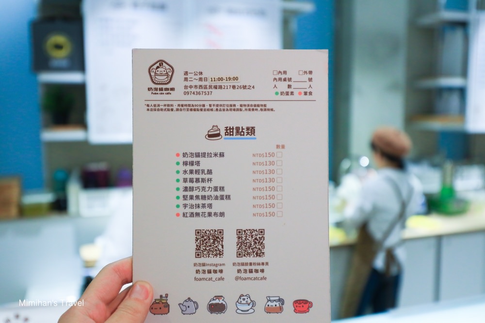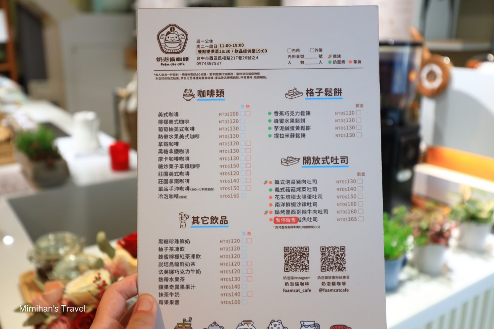 也把奶泡貓咖啡菜單附給大家參考,有咖啡、甜點、格子鬆餅、開放式吐司和其他飲料等選擇,裡面最吸睛的就是奶泡貓提拉米蘇,造型就跟上面那張圖一樣,但想吃要趁早,我們這天來的時候已經賣光光有點可惜。