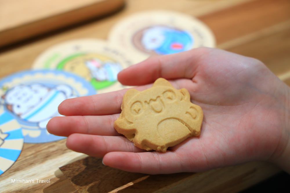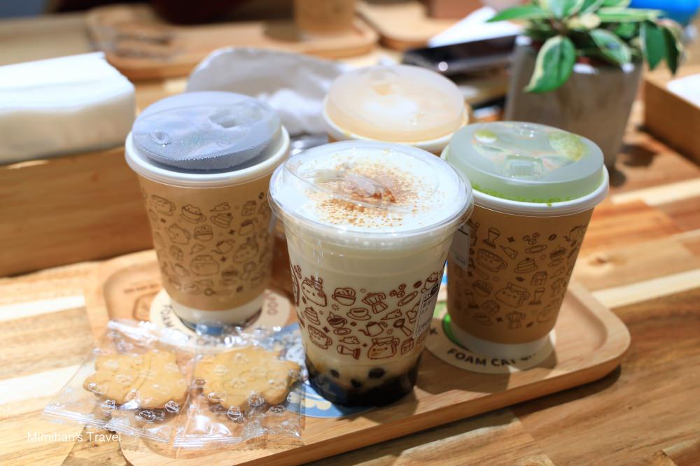 姊兩大兩小來一口氣點了四杯飲料,分別是美式咖啡、拿鐵咖啡、抹茶拿鐵和黑糖珍珠鮮奶,飲料還會附贈一個小餅乾。還有杯子的外型也設計得很可愛,滿滿都是奶泡貓的插圖。