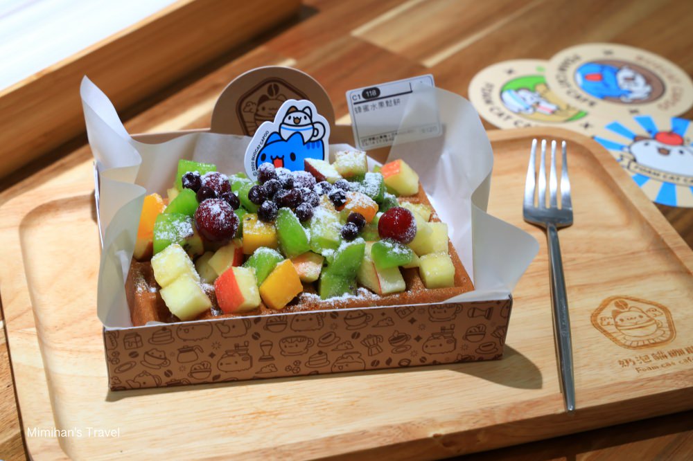 蜂蜜水果鬆餅,底下一樣是硬脆的格子鬆餅,上面滿滿的奇異果、蘋果、小紅莓、冷凍芒果⋯然後淋上蜂蜜,選用的都是偏酸的水果,該怎麼說呢?整份水果很多蠻營養沒錯,但吃完似乎沒有那種吃到甜蜜點心的幸福感哈哈哈哈。