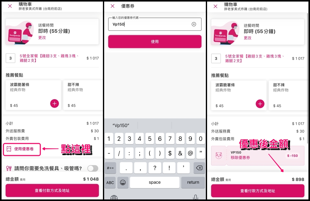 Foodpanda折扣碼、優惠碼折價券使用很簡單,選好餐點之後結帳介面會出現”使用優惠券“的選項,點選並輸入要使用的優惠碼即可,系統也會直接計算優惠後金額。