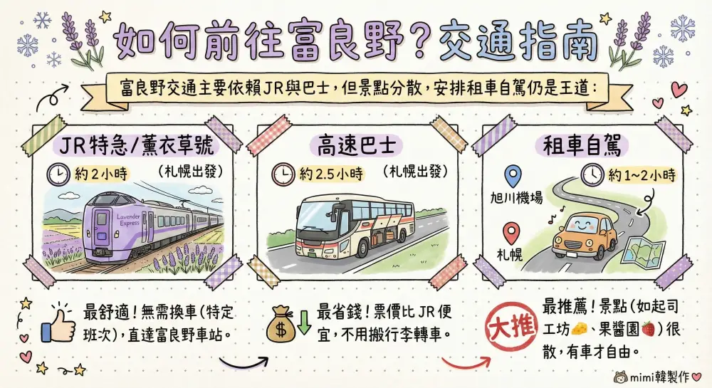 富良野交通主要依賴JR與巴士,但景點分散,安排租車自駕仍是王道: