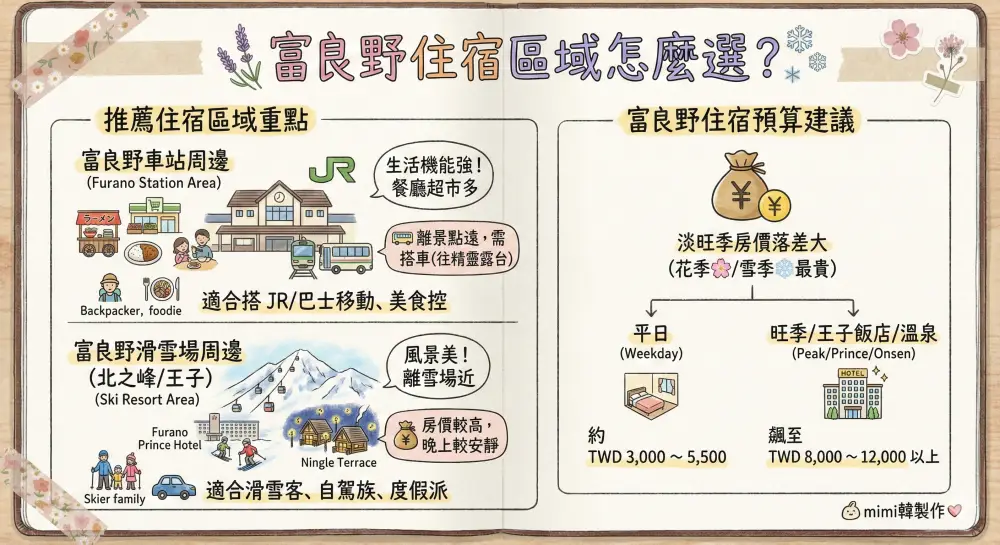 - 富良野車站周邊: 適合搭 JR/巴士移動、美食控。優點是生活機能強,餐廳超市多;缺點是離滑雪場和精靈露台有一段距離(需搭車)。