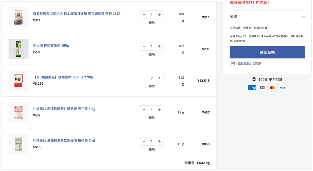 選好商品就可以準備結帳,請確認買品項、數量是否正確,系統也把運費都計算出來,透過郵政國際快捷EMS送貨,需注意運費會隨著商品重量上升,不過札幌藥妝也很貼心提供免運折扣碼,滿額最高可以省4,400日圓的運費唷!