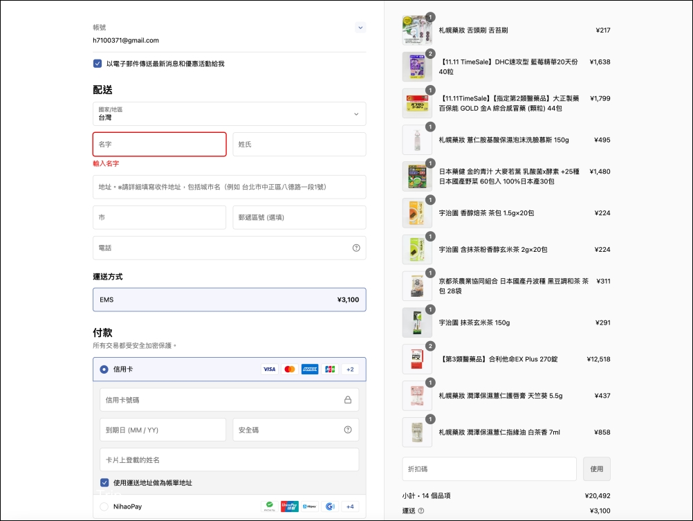 最後選擇付款方式,輸入收件資料,姓名/地址都可以輸入中文,不用特地去翻譯,搞定之後系統會發送有訂單編號的郵件到信箱,方便後續追蹤包裹,接著就可以在家等收貨啦!