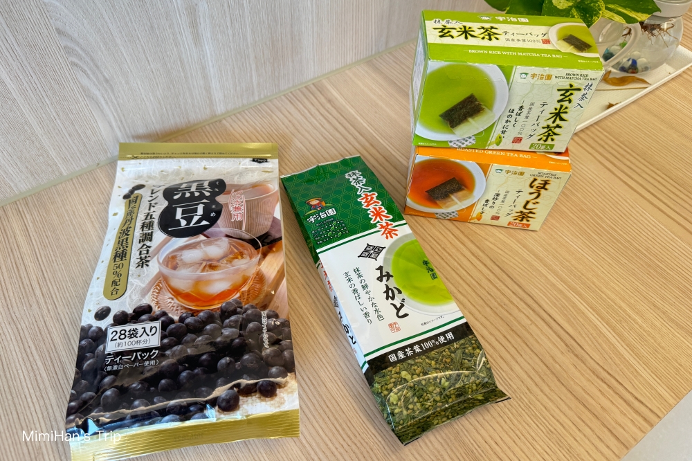 最近很愛喝的黑豆水也有賣,中醫說可以幫助消水腫、提升氣色,這款是用日本國產丹波黑豆來製作,泡水喝起來香氣清爽很舒服 。另外像是玄米茶、焙茶、抹茶茶包等都是家裡常用品,近期沒計畫去日本就一起買回來相當方便。