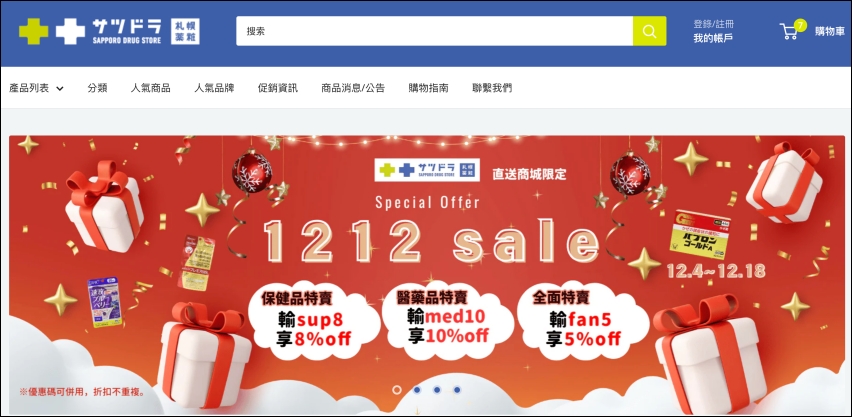 而札幌藥妝海外直送商城可以買到許多來自日本北海道的商品,定期會上架新商品,還會不定期推出各種優惠活動,像近期1212特賣就有全面5%OFF,醫藥品10%OFF等優惠活動(請以網站首頁公告為主),而且購物滿額免運,買完在台灣等收貨非常方便。