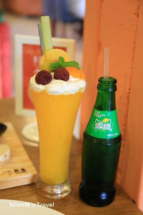 雪碧是套餐飲料,芒果冰沙清涼爽口,上面另外有加一點櫻桃、柑橘等水果。