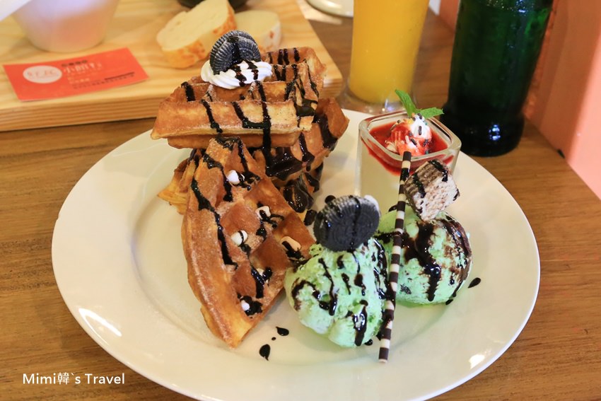 還點了一份巧克力冰淇淋鬆餅($200元),鬆餅口感紮實,搭配兩球薄荷冰淇淋和草莓優格,是挺稱職的下午茶點心。結帳時店員會給一張入園票,上面也會清楚的寫著人數,吃飽喝足,就可以出發往旁邊的好好聚落移動囉!