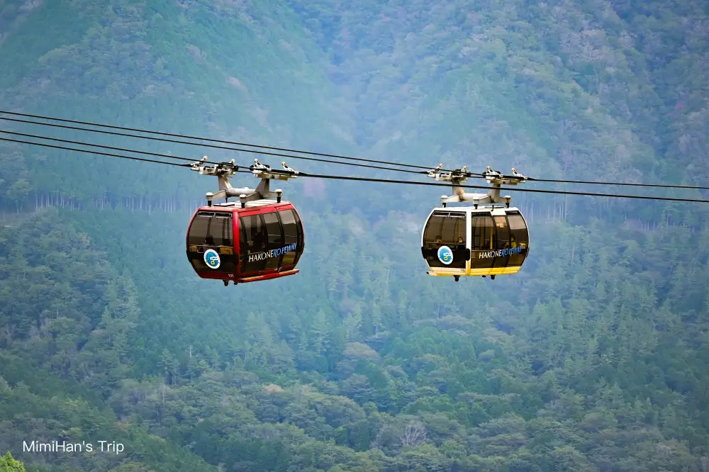 抵達強羅後可以轉乘「箱根空中纜車」。纜車一路攀升至大湧谷,途中視野開闊,可以俯瞰山谷、湖泊與火山景觀,是許多家庭與情侶的必體驗路線。